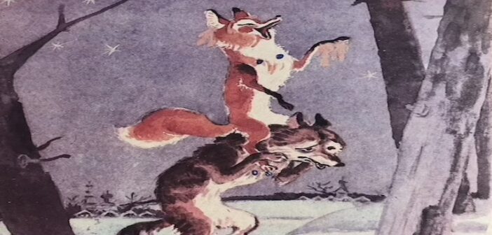 Он поехал вперед и не хватился рыбы. А лисица подобрала рыбку, сносила ее в свою лачужку да и лакомится. Приходит к ней волк и говорит: «Хлеб-соль, кумушка! — «В хлев зашел, так двери ищи, куманек!» — Ой, милая кумушка, ты еще рыбку ешь?» — «Как же! Сегодня маленько, бог дал выудила!» — Ой, ли! Где ты удила?» — В проруби, в проруби, мой миленький куманек!» — «А как?» — Очень просто: только хвост-от погрузи в воду, так такие рыбины прицепятся, что любо-дорого! Чем больше посидишь, тем больше выудишь; только не дергай скоро, дай заклевать; а если клевать не будут, то заговор читай: «Рыбка, клюнь — попади, меня за хвост потяни!»