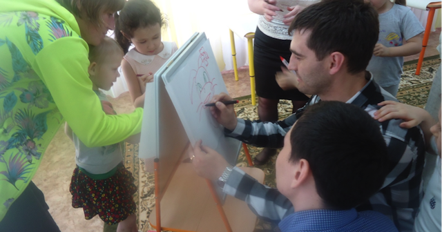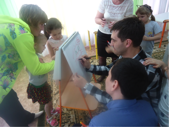 Нужно договориться об очереди, кто за кем рисует, чтобы поучаствовать смогли все. Удобно, поместить лист бумаги на мольберте, каждый участник, подходит и рисует деталь, какую он хочет.